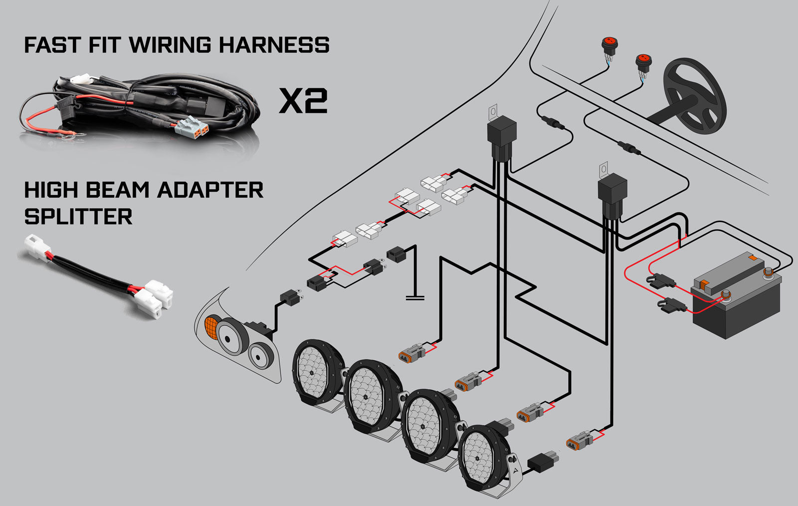 Fast Fit Wiring Harness - Direct Install with a fully configured harness. Battery Terminals, Fuse, Relay, In Cabin Isolation Switch and H4 + HB3 high beam connections.