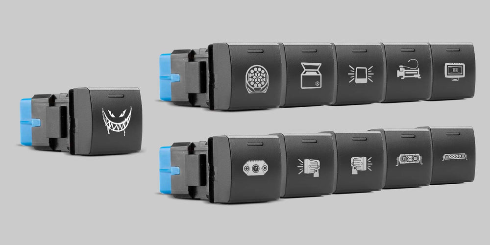 Our Square switches are a direct clip in install and wiring is easily accesible to the drivers kick panel. Available in both momentary and constant on/off switches, think truck horn for momentary and work lights for constant on/off.