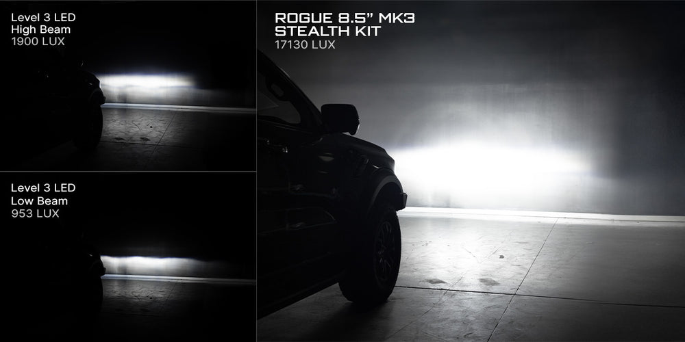 Mounted stealth, the Rogue Mk3s still deliver a staggering 1 lux at 1199 metres — offering over 9x the output of the factory Level 3 LED headlights. This isn’t just an upgrade — it’s a redefinition of what behind-the-grille lighting can do.