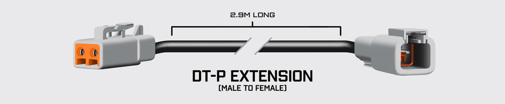 The DT-P Wiring Extension features 2.9 meters of 12-gauge wire equipped with Deutsch DT-P male and female plugs. This extension is perfect for extending your wiring reach for roof mounted Light Bars, ensuring a secure and reliable connection.