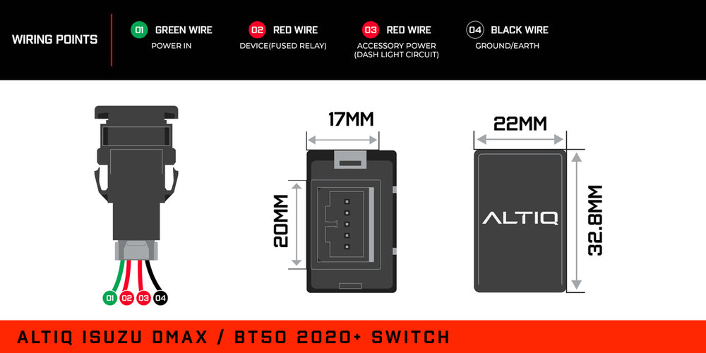 Upgrade your Isuzu with our premium aftermarket interior switches, designed for seamless control of your 12V accessories. These constant on/off push latch switches are available with a variety of laser-etched symbols, including spotlight, light bar, smiley face, and work light, perfectly tailored to your needs. Each switch is direct-fit for your Isuzu, featuring an LED backlight for clear visibility at night and comes pre-wired for easy installation, synchronising with your dashboard lights.