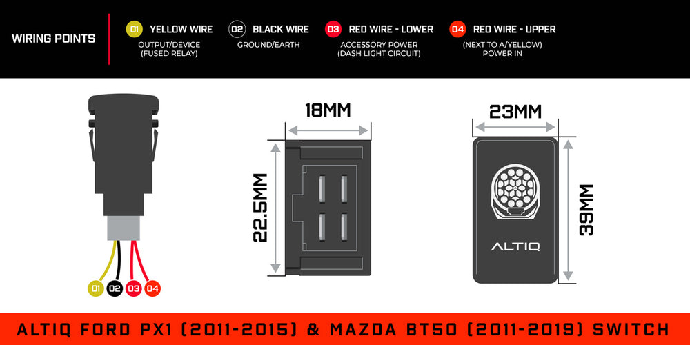 - Customisable Options: Choose from various ALTIQ-specific switch designs that complement your vehicle's interior while suiting your accessory needs.