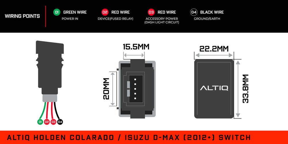 Engineered specifically for Isuzu DMAX (2012-2020) and Holden Colorado (2012-2020), the ALTIQ™ Push Button Switch provides a seamless integration solution for managing your vehicle's accessories. Designed to match the factory aesthetic, this switch offers precision fitment and effortless functionality without compromising the premium look of your dashboard.