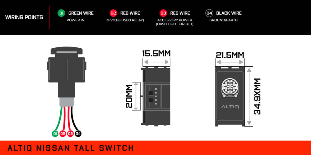 Whether you're upgrading your vehicle for work or adventure, the ALTIQ™ Nissan Tall Push Button Switch combines quality, reliability, and precision for the perfect interior upgrade.