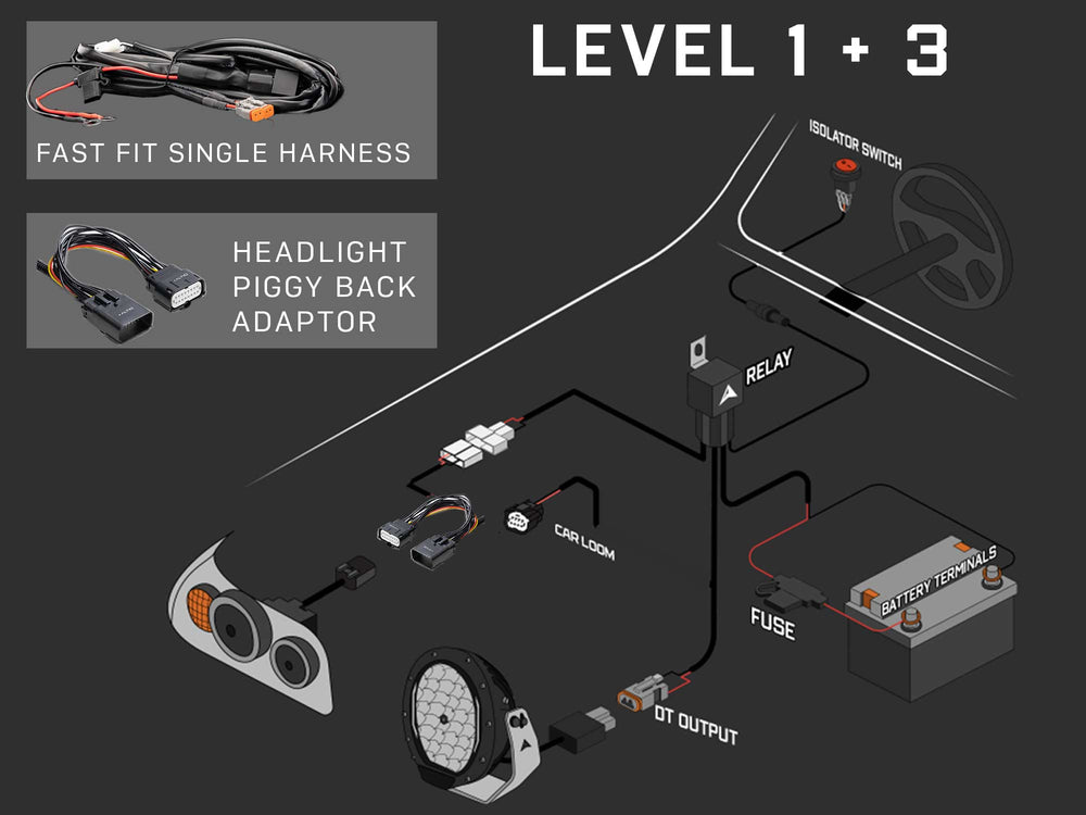 Level 1 & 3 Headlights - Fast Fit Single Harness + Headlight Piggy Back Adaptor.