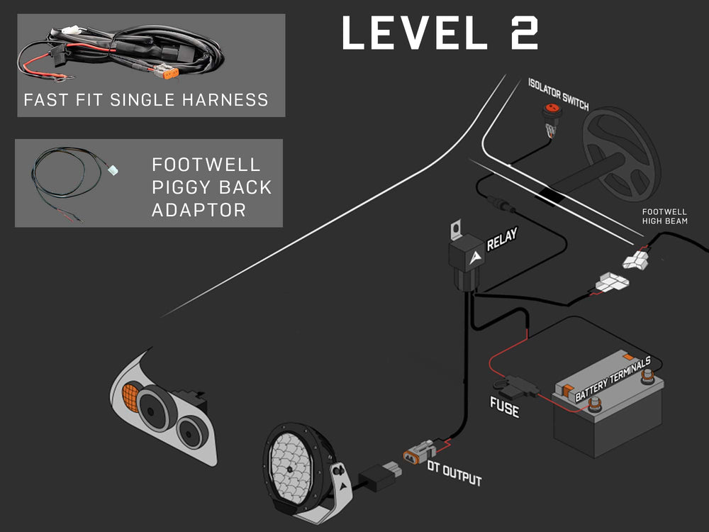 Level 2 - Fast Fit Single Harness + Footwell High Beam Piggy Back Wire.