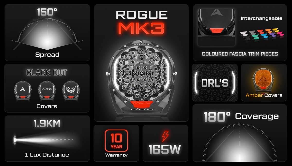 The Rogue Mk3 isn’t just about powerful illumination; it’s a statement piece for your vehicle. Choose between Cosmic Black and Arctic White finishes, with brackets and covers meticulously matched to the housing for a unified and striking appearance. The ALTIQ standard for attention to detail ensures that your lights not only perform exceptionally but also look incredible doing it.