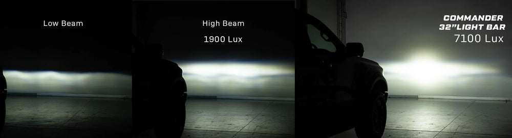 Experience Unmatched Brightness! Our intensive testing demonstrated that the factory high beam achieved 1900 peak lux. But, with the Commander 32" Light Bar in action, we witnessed a staggering rise to 7200 lux. That's a solid fourfold increase in brightness at any range, enhancing visibility and boosting your confidence while navigating the most challenging terrains.