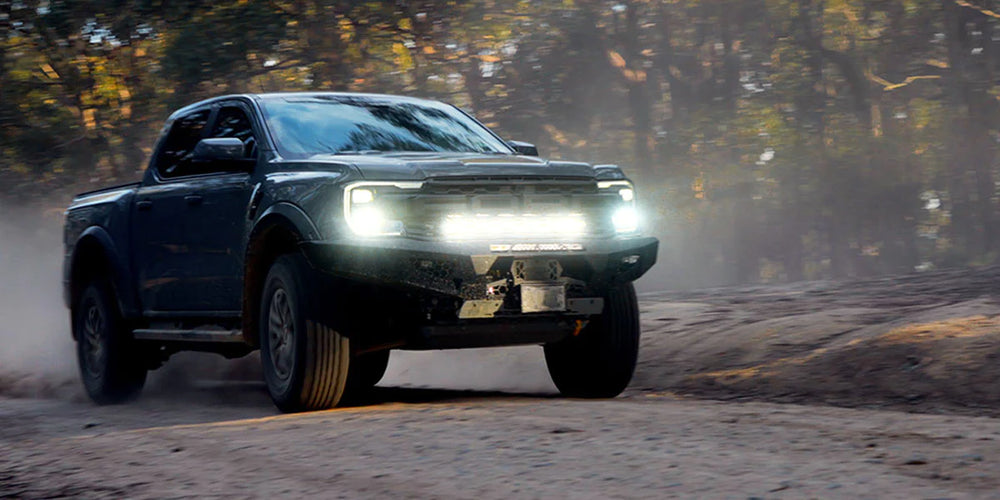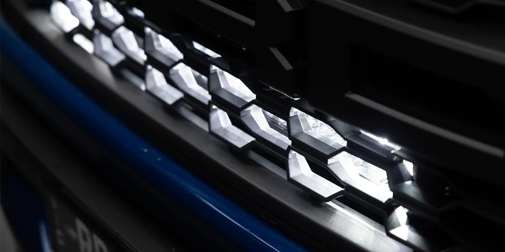 The Next Gen Raptor is equipped with the best LED headlights on a Ranger to date; however, with ADR lumen limits, there's still a lot to be desired for both lumen volume and distance, especially in higher speed, Baja conditions. Our solution? A bespoke kit to mount our renowned 32" Double Row Commander LED Light bar behind the grille, boasting a near four-fold lux increase with factory integration to the Auxiliary switches.