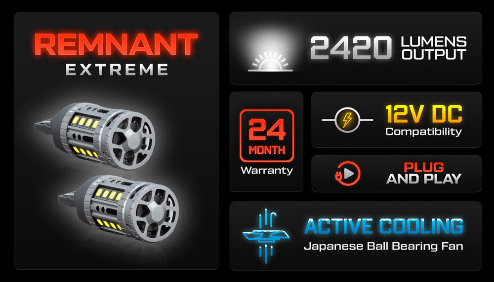 The Remnant Extreme T20 LED Reverse Light delivers 2420 lumens per globe, offering over 5x the brightness of standard halogen bulbs rated at 460 lumens. This significantly enhances rear visibility, improving safety in low-light and night-time reversing scenarios.