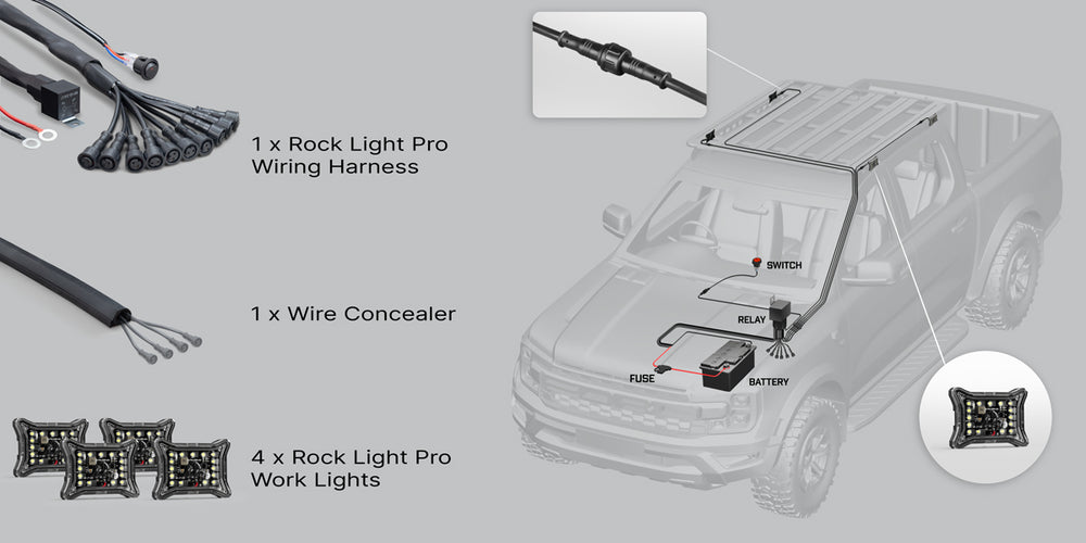 From roof rack setups to underbody lighting, this harness is engineered to keep your install clean, reliable, and totally modular. Whether you're building the ultimate camp setup or adding full 360° coverage to your canopy or tub, the Rock Light Pro harness is ready for the job.