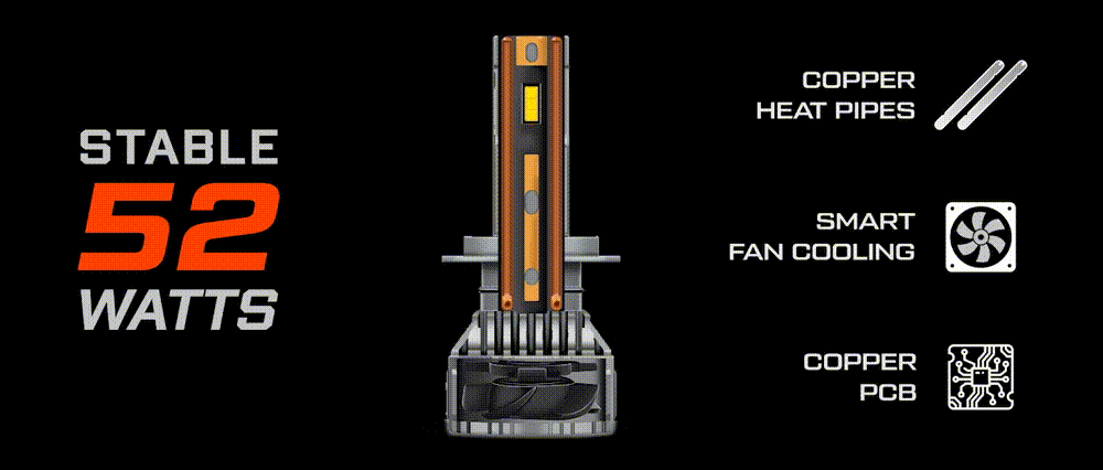 The V5 LED Headlight Conversion Kit is engineered with an advanced active cooling system that starts with a copper PCB (Printed Circuit Board). Copper is one of the best conductors of heat, efficiently pulling heat away from the LED chips. The heat is then transferred through copper heat pipes, which contain a small amount of liquid to enhance thermal management, moving the heat to the heat sink for even distribution.